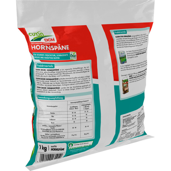 Organischer Langzeitdünger mit Horn – für Garten und Landwirtschaft Der organische Stickstoffdünger Cuxin DCM Hornspäne liefert Pflanzen in Gemüse-, Obst- und Ziergärten nachhaltig Nährstoffe. Die Nährstofffreisetzung erfolgt über Bodenmikroorganismen langsam und gleichmäßig, wodurch Wachstum, Blüte und Fruchtbildung unterstützt werden. Gleichzeitig trägt der Dünger zur Humusbildung und Verbesserung der Bodenstruktur bei. Vorteile 13 % Gesamtstickstoff (N) – organisch gebunden 100 % organische Rohstoffe aus Horn (tierische Nebenprodukte Kat. 3) Langzeitwirkung: Nährstoffe werden schrittweise freigesetzt durch Bodenmikroben Mild im Einsatz, keine Verbrennungsgefahr bei sachgerechter Anwendung Zugelassen für den kontrolliert biologischen Landbau gemäß EU-Verordnung Wir empfehlen vorab eine Bodenanalyse mit dem Cuxin DCM Bodenanlyse Test-Set mit App-Unterstützung Produktdaten ProduktgruppeDünger Gebindegröße (1 kg)Flächenabdeckung ca. 20 m² Gebindegröße (5 kg)Flächenabdeckung ca. 100 m² HerstellerCuxin DCM Hersteller-Art.Nr.1004968 Geeignet für Gemüse- und Obstgärten Zierpflanzen und Blumenbeete Beet- und Topfkulturen Anwendungsgebiet Grunddüngung (Februar–März) Erhaltungsdüngung (Mai–Juni / August) Gemüse 30–60 g/m² 25–50 g/m² Obst 50–60 g/m² 40 g/m² Erdbeeren 30–40 g/m² 20 g/m² Rosen 50 g/m² 30 g/m² Gehölze / immergrüne Pflanzen / Stauden Bei Ballenpflanzen CUXIN DCM Hornspäne ins Pflanzloch einmischen 30–40 g/m² Balkon- und Topfpflanzen Beim Pflanzen/Umtopfen Hornspäne in die Pflanzerde einmischen (70 g/10 L) 50 g/10 L Erhältlich als 1 kg - Flächenabdeckung ca. 20 m² 5 kg - Flächenabdeckung ca. 100 m² Bitte bei Bestellung Gebindegröße beachten! Hinweise Anwendbar im biologischen Landbau gemäß der Verordnung (EU) 2018/848 und deren Änderungen. Die Produkte enthalten nur Rohstoffe, die gemäß Anlage I und II der EU-Verordnung (EG) Nr. 2021/1165 über die ökologische/biologische Produktion und Änderungen zugelassen sind. für Kinder und Haustiere unzugänglich lagern trocken und kühl aufbewahren bitte beachten Sie die Hinweise und Anwendungsempfehlung des Herstellers