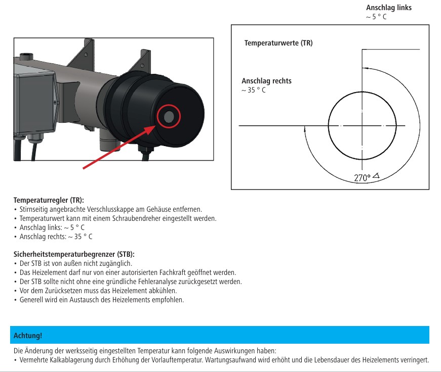 - LED-Anzeige am Schaltkasten: Heizelement aktiv