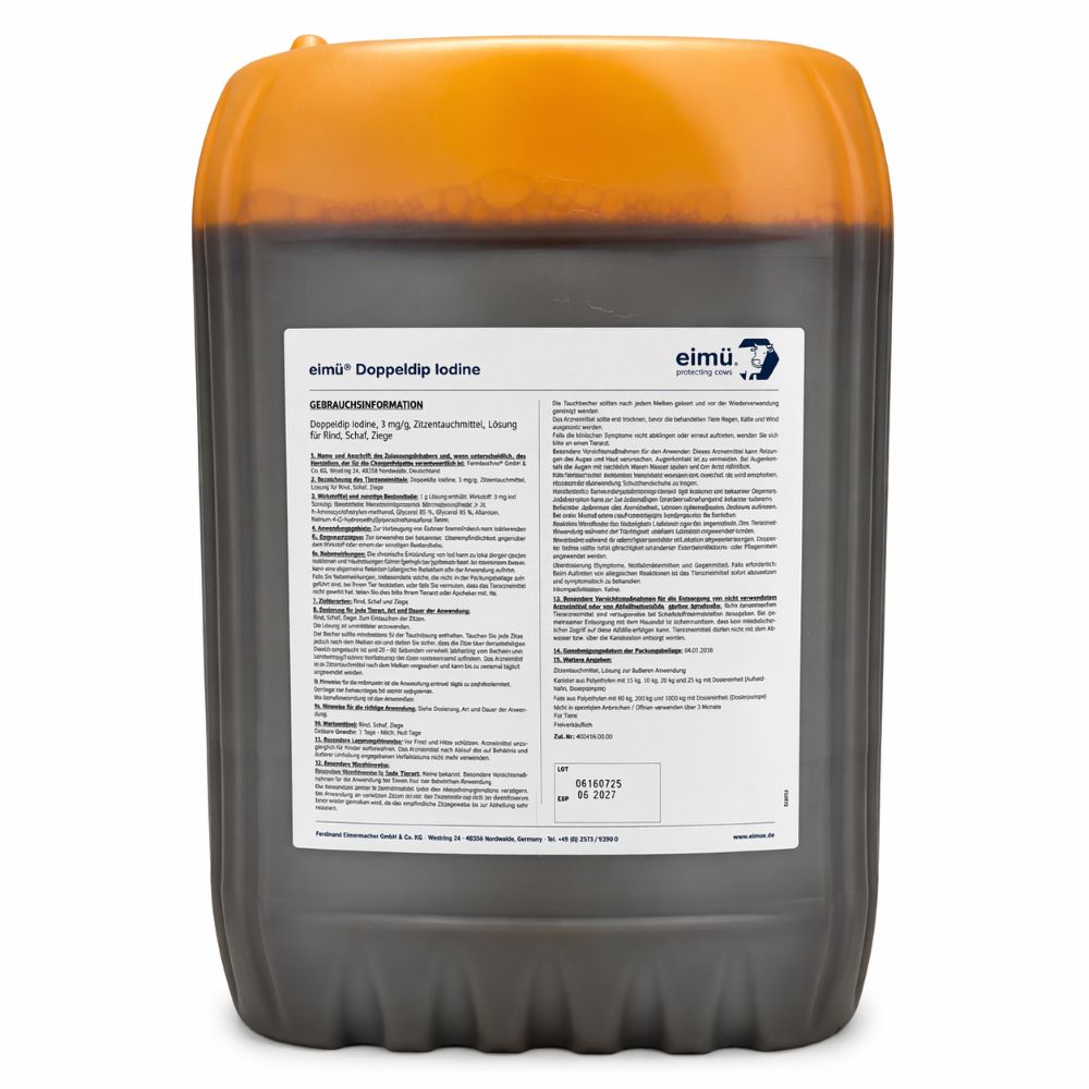 Das Zitzentauchmittel eimü® Doppeldip Iodine ist ein freiverkäufliches Tierarzneimittel zur Vorbeugung von