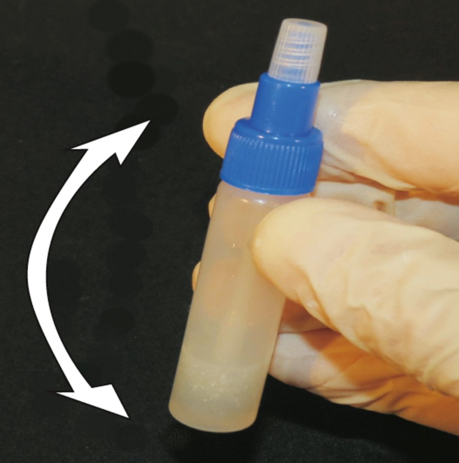 - 3–5 Tropfen der Probe in das Probenröhrchen geben, bis sich die Pufferflüssigkeit deutlich verfärbt. Röhrchen fest verschließen und kurz schütteln.