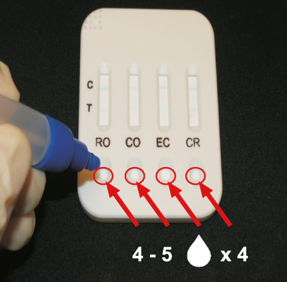 weitere Tropfen in die Probenöffnung geben – nicht auf die Anzeigefelder tropfen. Lagerung trocken bei 2–30 °C.